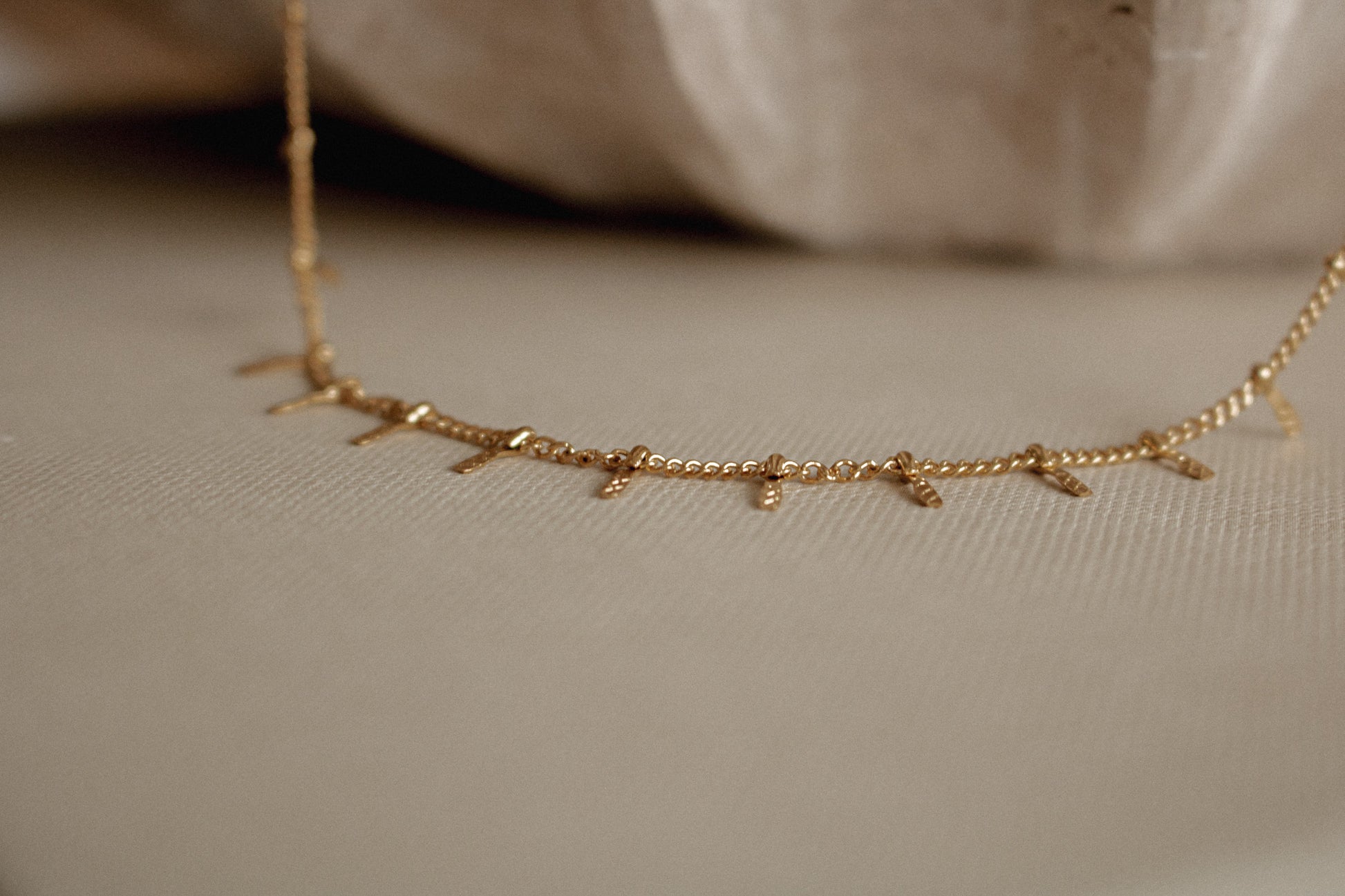 A dainty curb chain necklace featuring tiny paddle shaped charms.