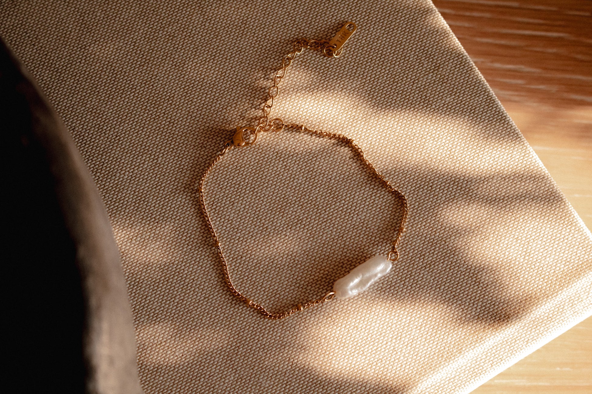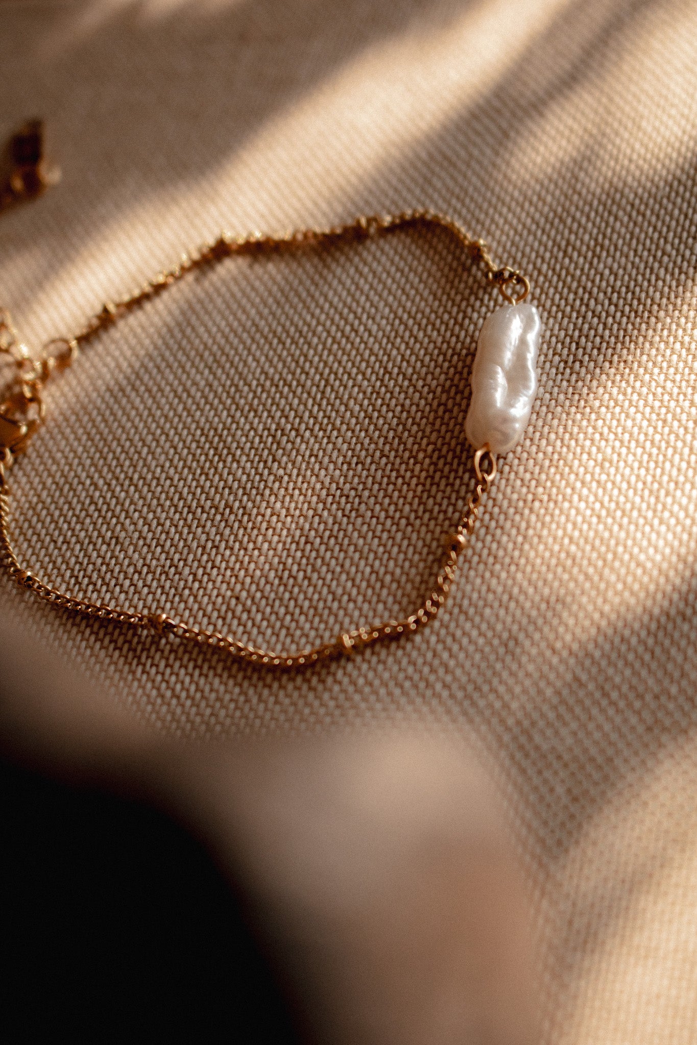 This delicate gold bracelet highlights subtle details with its fine chain adorned by small gold beads and a distinctive baroque pearl charm, offering a natural, unique appeal. Its lightweight design makes it comfortable for everyday wear, adding a refined yet effortless elegance to any look, from casual to dressy.