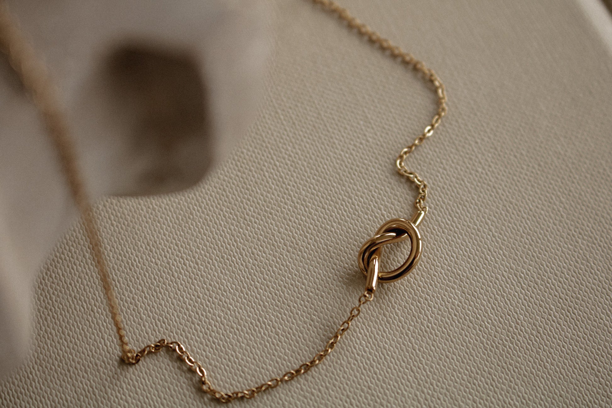 The gorgeous knot pendant necklace will be a staple in your jewelry box. Featuring a gold knot on a tiny o-shaped chain.