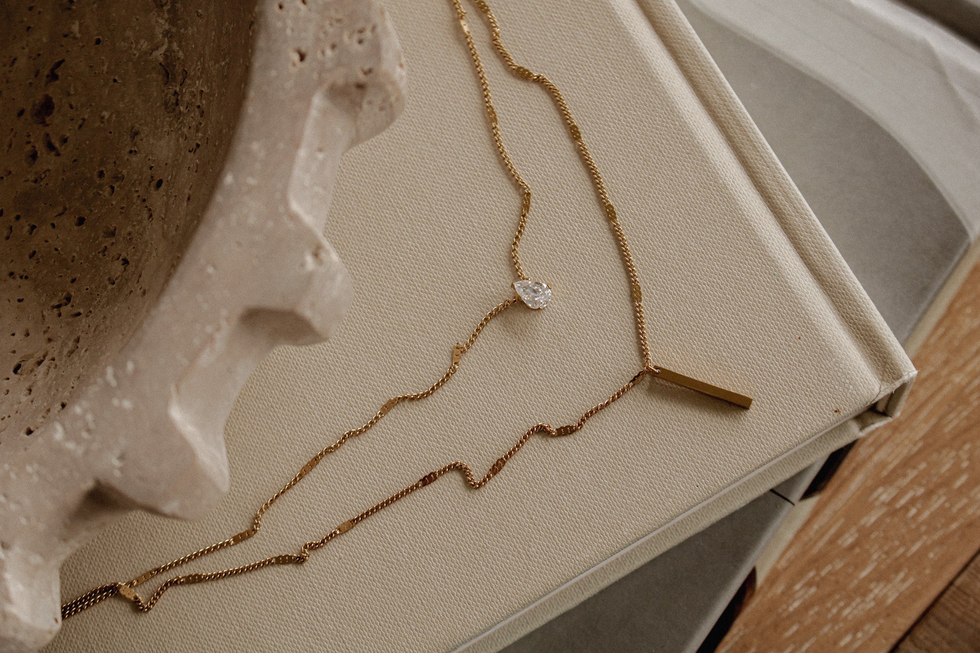 Two necklaces in one. Get this pre-layered style with the ease of one clasp. Hook and go! The Rosaline Necklace features a unique curb chain with a clear stone pendant and bar charm.