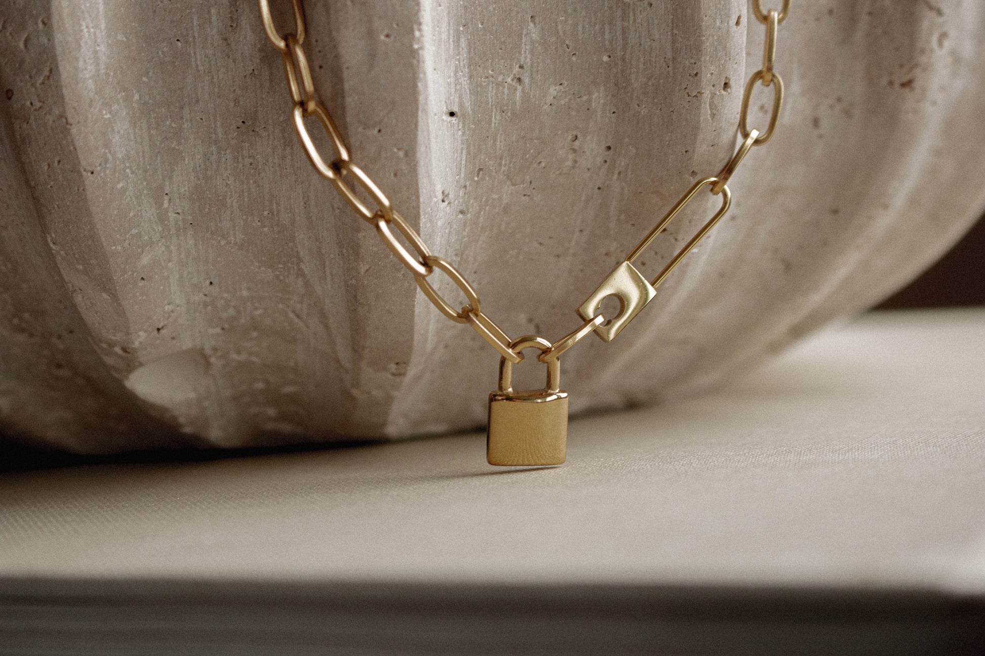 The Claribel Necklace combines a trendy paperclip with a lock charm for an edgy look. It has a large oval chain that's perfect for layering with other necklaces.