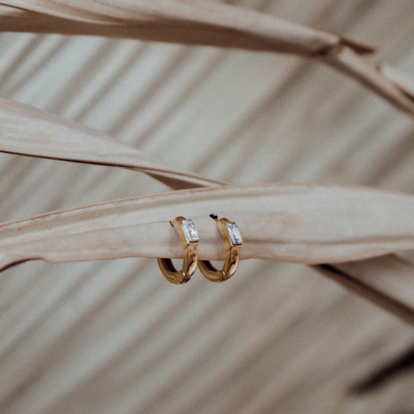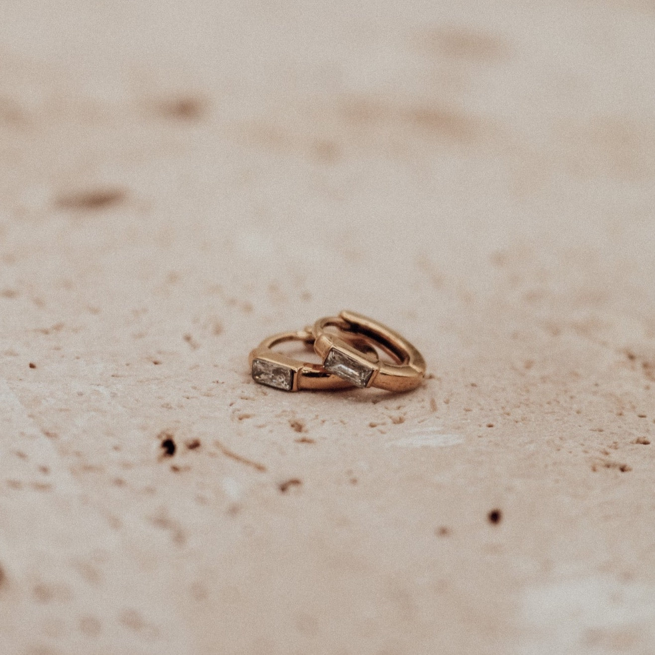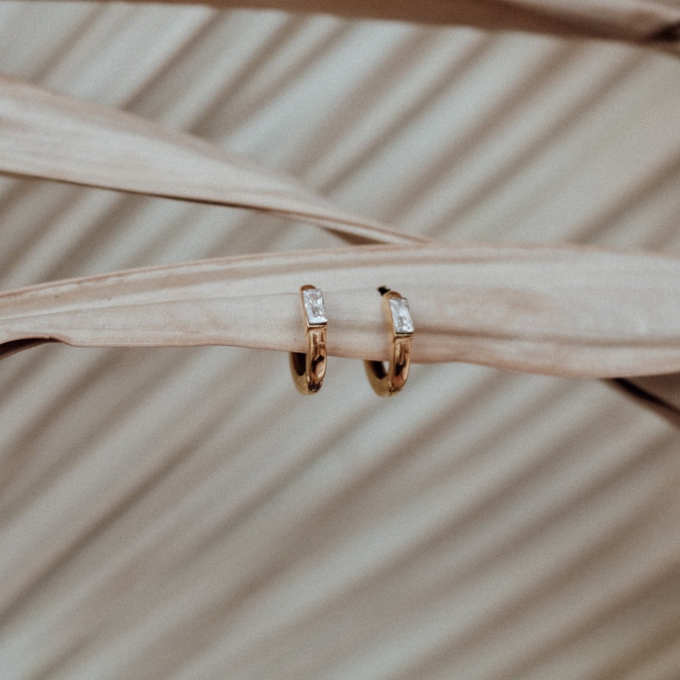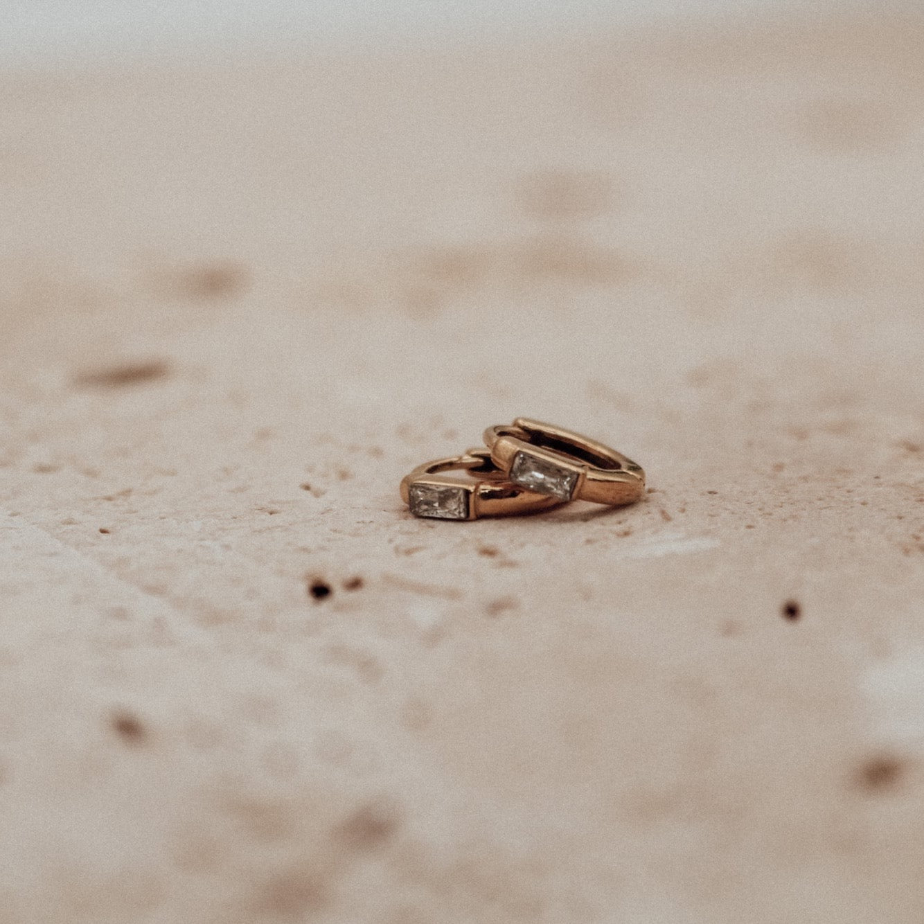 The perfect tiny everyday pair of huggies. These mini round hoops feature a single rectangle crystal. Minimalist and go with everything!